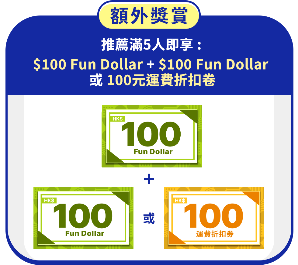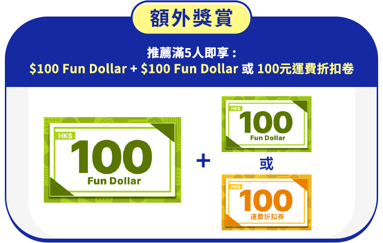 - 若「獎賞二選一」選擇「Fun Dollar」,Fun Dollar使用期限至發放後第30日之晚上23:59。Fun Dollar可於全館「第一次付款」時使用,可折抵服務費、商品費用。