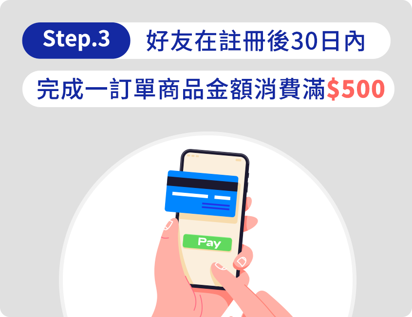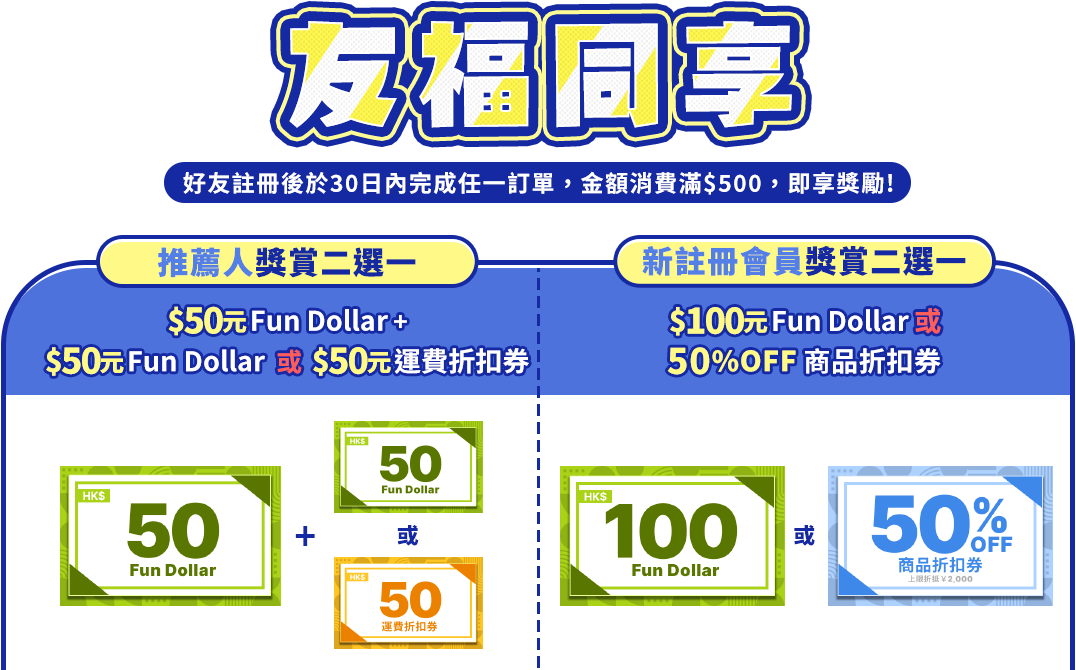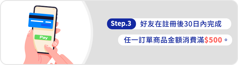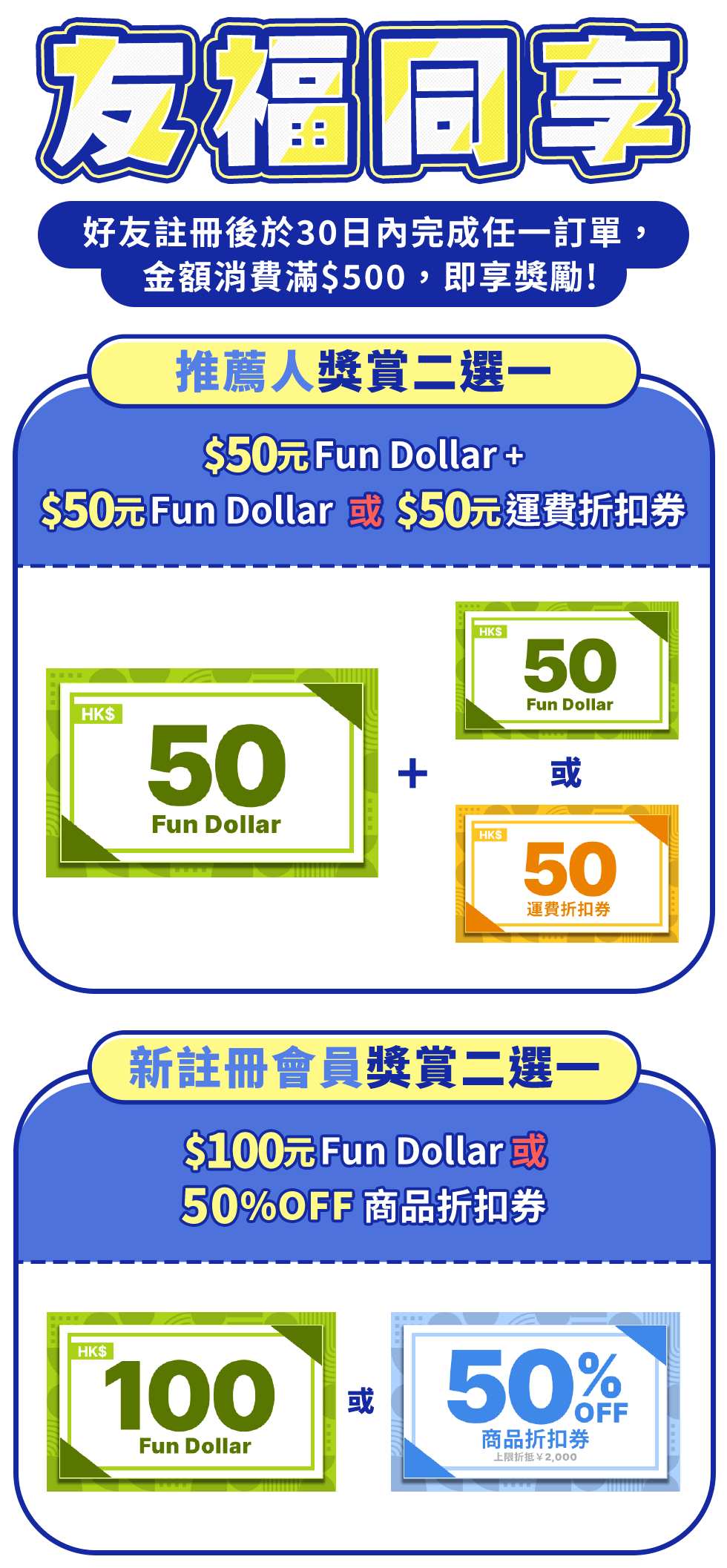 - 好友在註冊日起30日內完成任一訂單,「第一次付款」之商品金額滿HKD$500。