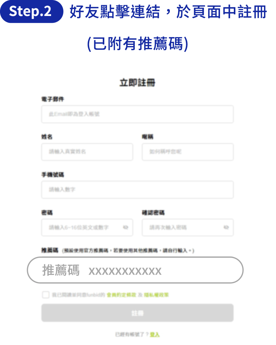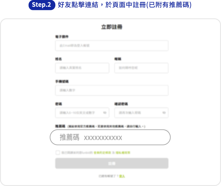 - 請於【我的帳戶】查看推薦碼 及 提供給好友於註冊過程中使用。(若好友註冊時沒輸入推薦碼,則無法補使用。)