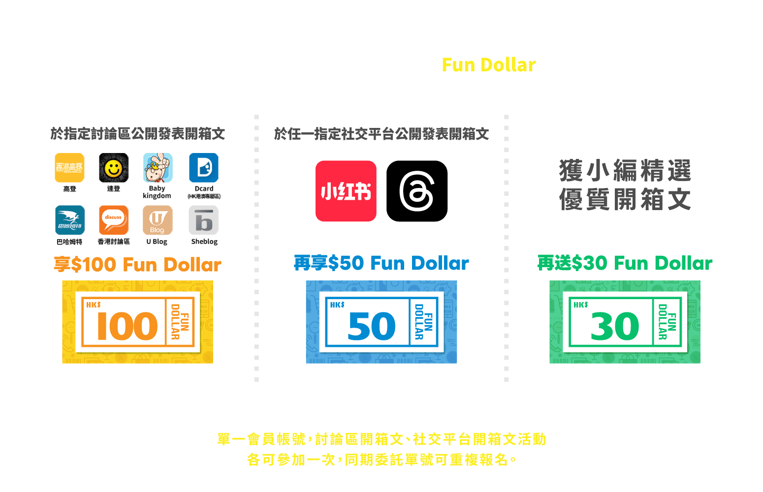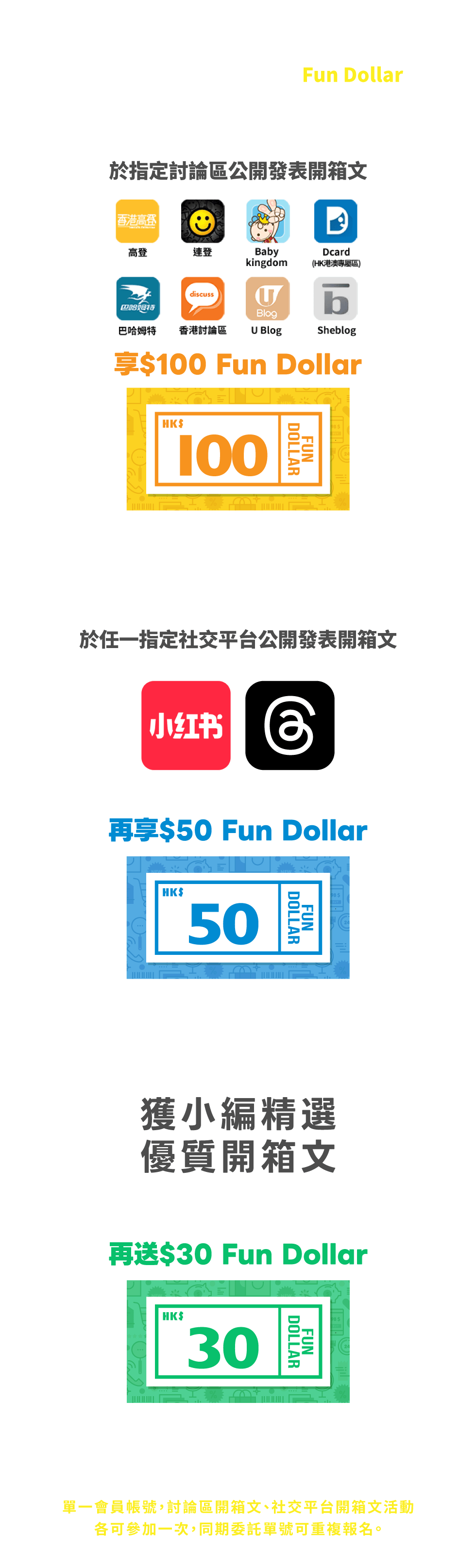 每期活動結束後,小編會挑選一篇優質開箱文,並額外發放小編精選獎賞$30 Fun Dollar至會員帳戶中。