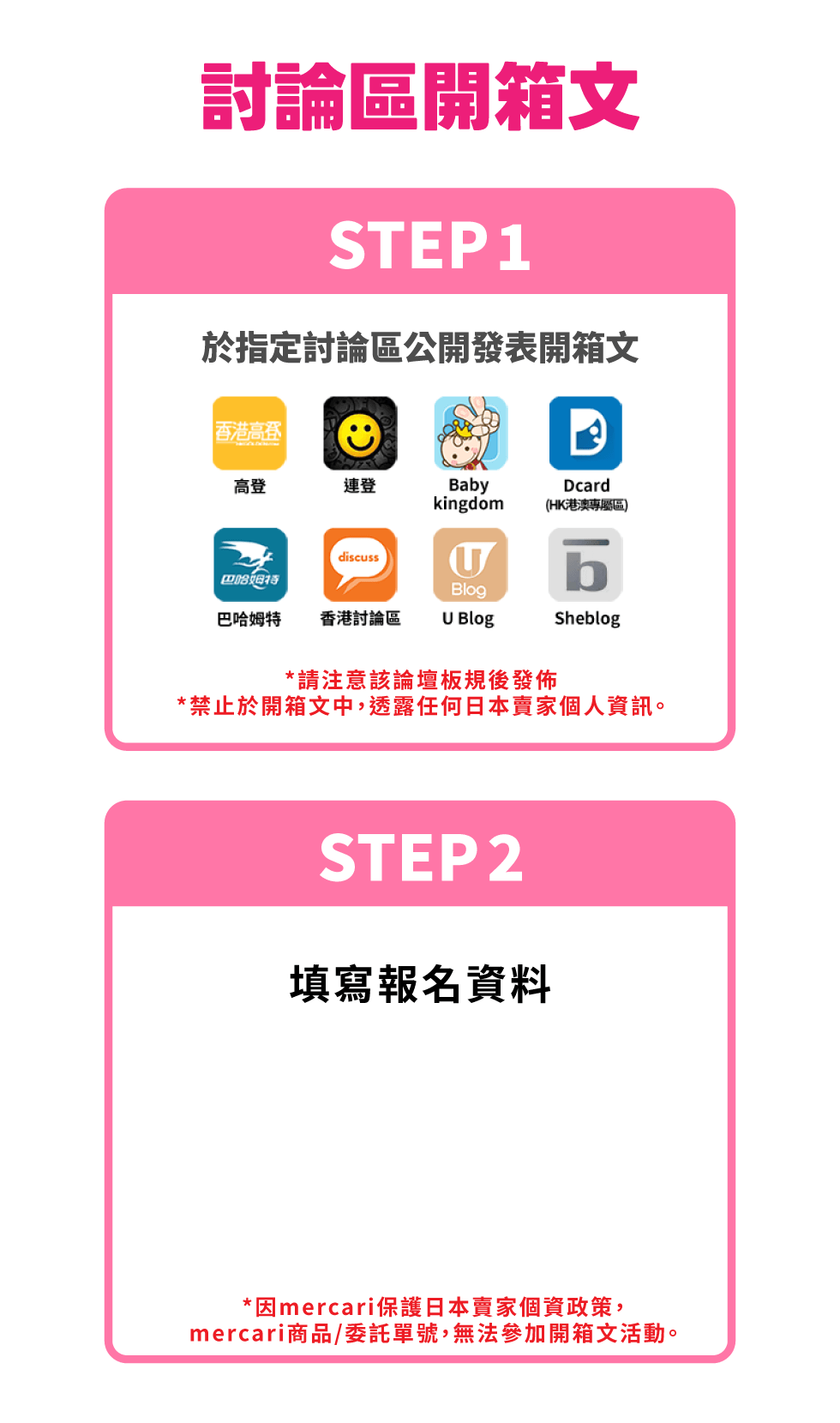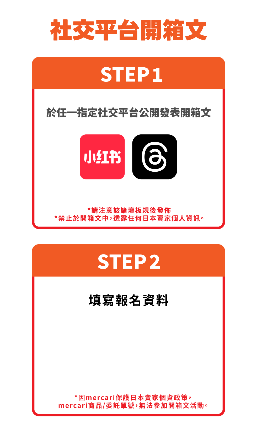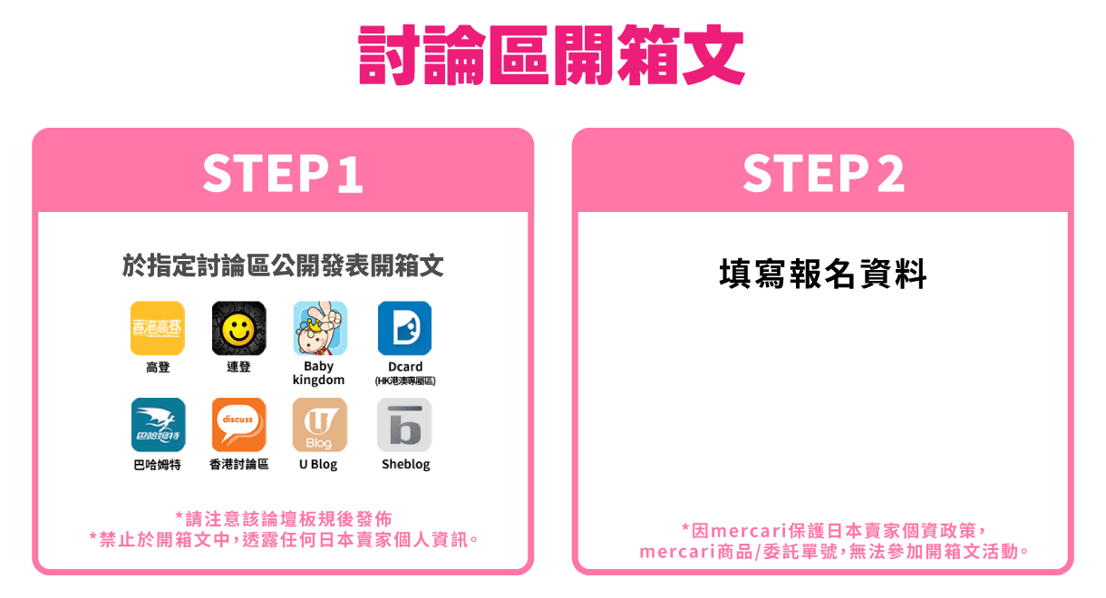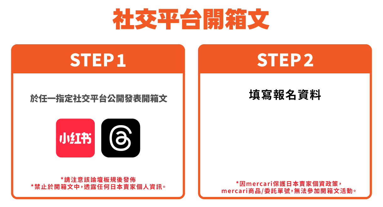 因mercari保護日本賣家個資政策,mercari平台之代購商品/委託單號,無法參加開箱文活動。