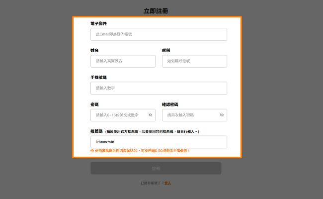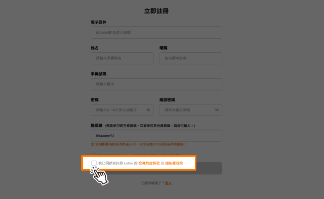 閱讀並同意《Letao條款》及《隱私權政策》後,按下「立即註冊」。