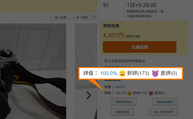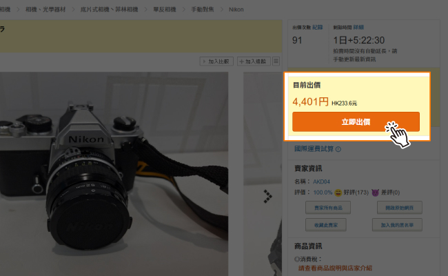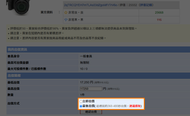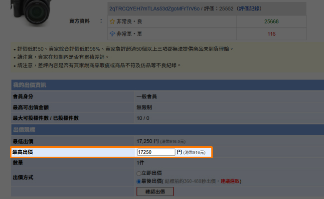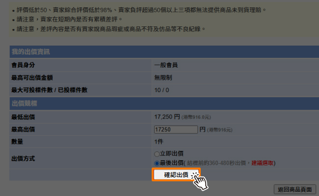 當您了解賣家、商品狀況等資訊後,可參與競標。