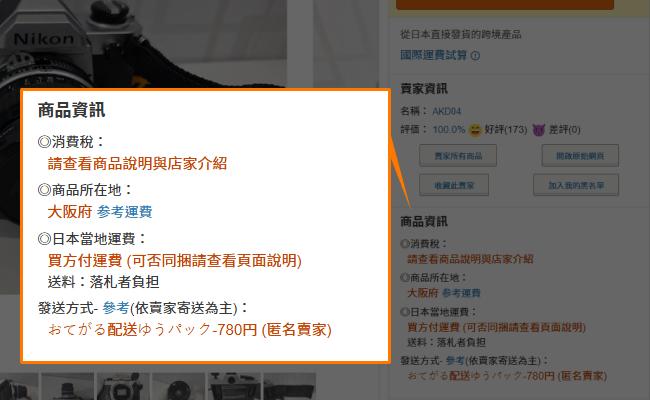 Step2.請詳閱「商品資訊」,確認消費稅、日本當地運費等資訊。