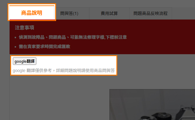 Step3.請詳閱「商品説明」,可點選翻譯工具,再確認注意事項、商品狀況等資訊。