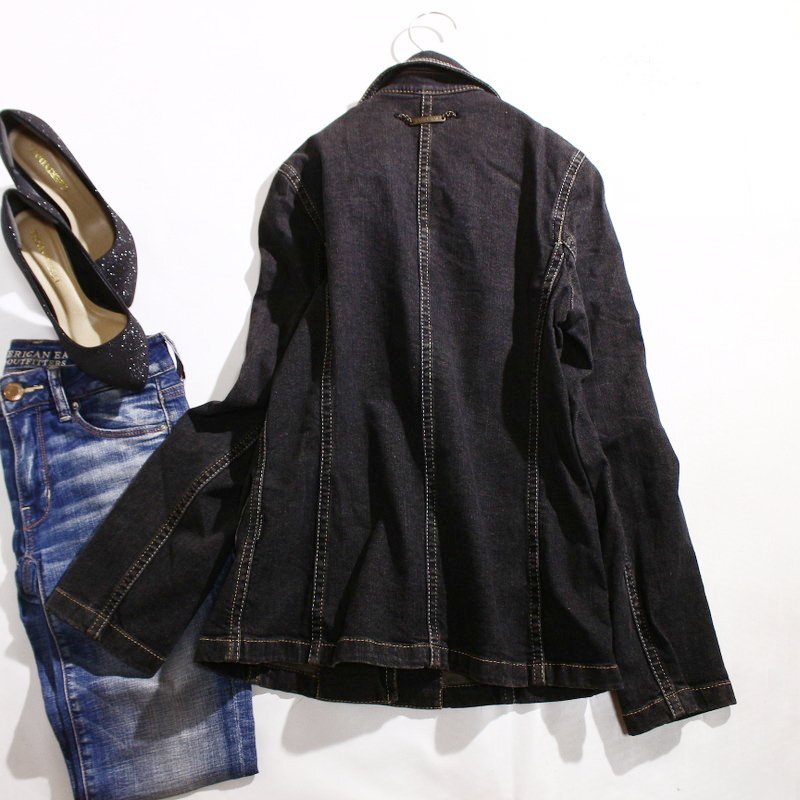 美品 エヴェックス バイ クリツィア EVEX by KRIZIA 合物 ロゴボタン デニムジャケット 11号 40 ブラック 黒 Gジャン デニム ミセス 秋 春