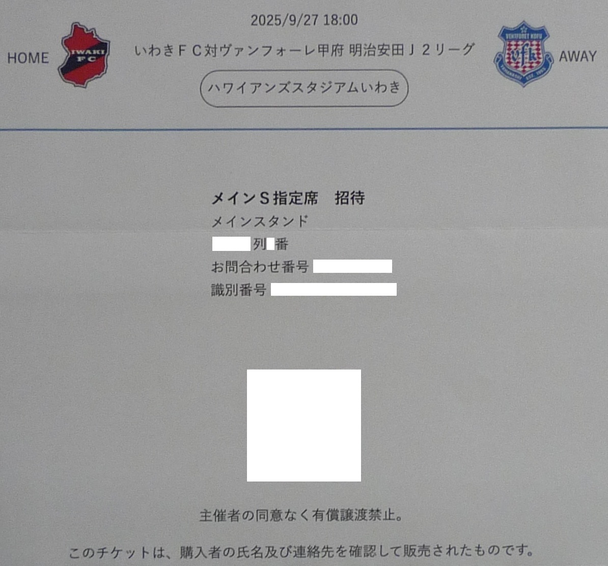 ■2025年9月27日(土) 18:00キックオフのいわきFC 対 ヴァンフォーレ甲府@ハワイアンズスタジアムいわきのチケットです。 |