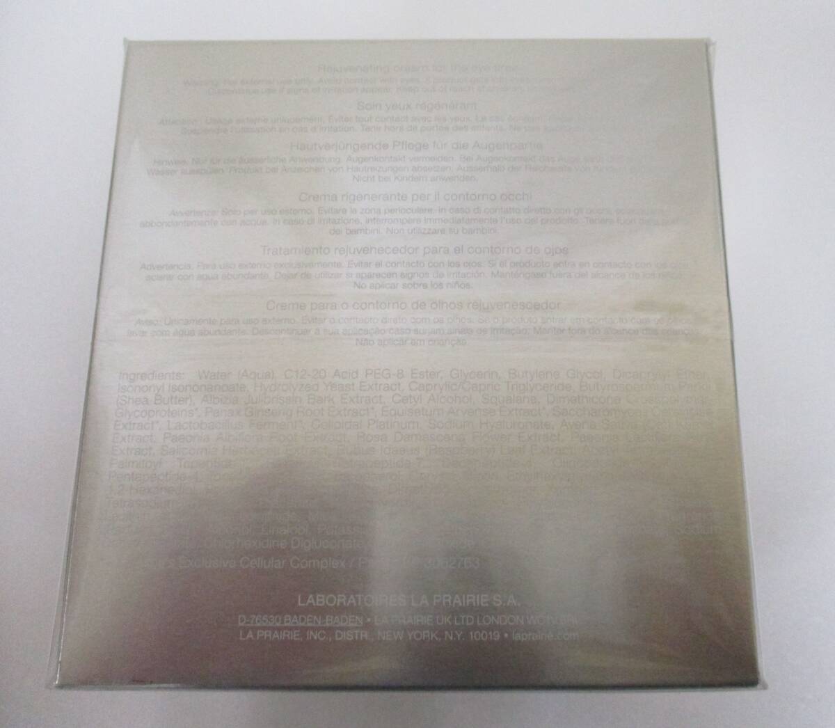 【訳あり・未使用】ラ・プレリー PTレア HR アイクリーム 20ml la prairie 2025年11月 未使用ですが使用期限は2025年11月です。 守られ、与えられ、見違えるようなまなざし。ラ・プレリーの最高峰ライン、プラチナムレアコレクションの目もと用クリームです。 プラチナムマルチペプチド* をはじめ、先端テクノロジーが息づく美容成分を配合し、目もとの乾燥やキメの乱れなどにアプローチ。 乾燥などの外的環境から肌を守りながら、見違えるようにしなやかでハリのある目もとの肌印象へ。 *整肌成分:コロイド性白金、デカペプチド-4、オリゴペプチド-6、パルミトイルペンタペプチド-4 容量:20ml スイス製 税込定価:138,160円