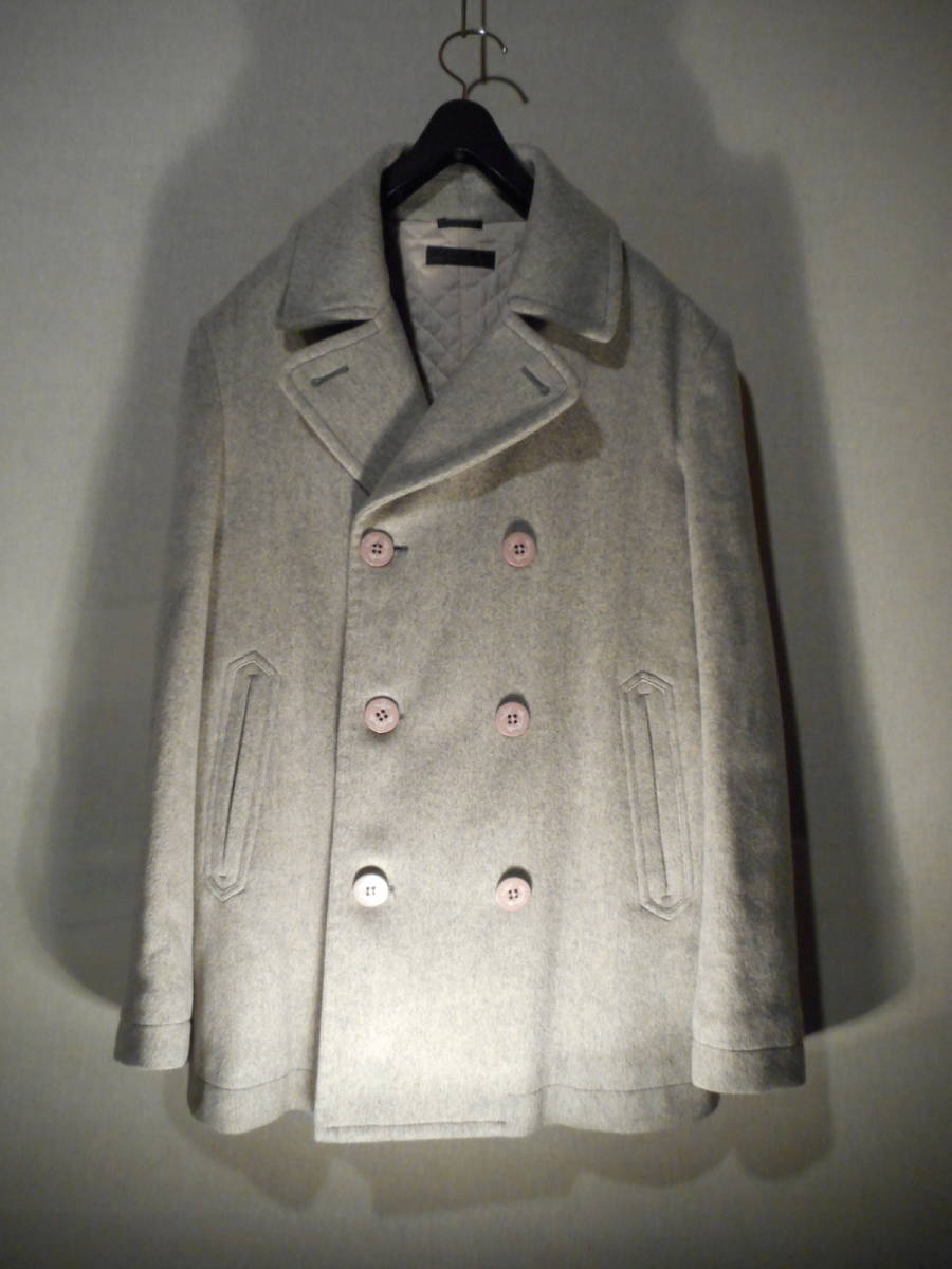 生地にはカシミアを50%、ヴァージンウールを50%を使用した柔らかくクオリティのよい柔らかいソフトなメルトン系生地を採用、ほんのり起毛感を感じさせる温かみのある風合いと肌心地で冬季に最適な品質へ、フォームはPコートスタイルを採用しており上部の襟はダイナミッ形良い形状ながら曲線を意識させるカッティングで首元から胸元にインパクトを与えます、フロント開閉は2列に配置されたボタンレーンでボタンには画像のように碇(アンカー)を刻印したアクセントに、