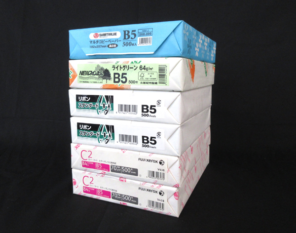 内 容 | ■コピー用紙 B5 ■内容量:500枚 ・C2 カラー/モノクロ兼用紙×2点 ・リボンスタンダード×2点 ・マルチコピーペーパー×1点 ・NEWファインカラー ライトグリーン×1点 |