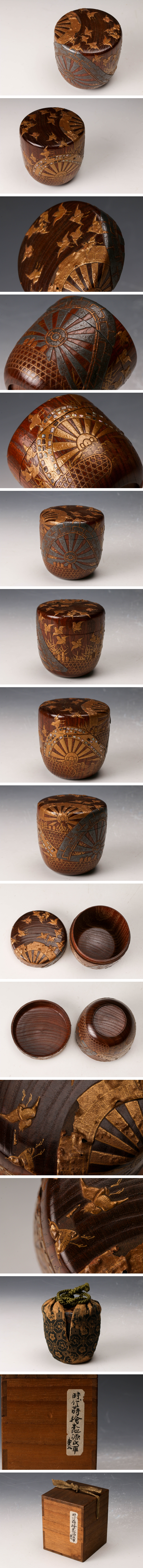 【佳香】時代 源氏車蒔絵棗 木箱 仕覆 茶道具 商品サイズ:高さ7cm/幅6.8cm/奥行6.8cm ※若干大きさに誤差はあります。 ※サイズは品物の最も端から端までを表記いたします。 ※複数点ある場合は一番大きいサイズを表記しております。 状態:蒔絵浮きハガレあり ※詳細は商品写真をご覧の上ご判断ください。 付属品:木箱 仕覆 発送サイズ:60 ※送料は下記送料についての表をご参照下さい。 ●古美術 佳香のオークション出品商品はすべて弊社にて直接ご覧いただくことが可能です。 下記までメールにてご連絡いただけましたらご用意致します。 keika@impregy.co.jp ご入札前に「古美術 佳香」の紹介文をご一読ください。 ※当社が扱っております品物は古美術品となりますので、神経質な方はご入札をお控えください。 ※商品写真をご覧になるモニター環境、商品の素材などの特性により、 色合いなど実物と多少誤差が生じる場合があります。 商品写真とイメージが違う等のキャンセルはお受け出来ませんので予めご了承ください。 ※木箱(合わせ箱について) 保存・保管のみを目的とした木箱であり 出品中作品との関連性は一切ございません。 稀に他の作品名・作家名が書き付けられた木箱をお付けしております。作品との関連性は一切ございませんのでご了承ください。 ※箱や付属品の状態は表記いたしませんので写真をご参照下さい。箱紐は掲載が無い場合は付属しておりません。 ※撮影時に使用しているイーゼルや皿立の付属品に記載のないものは付属しておりません。