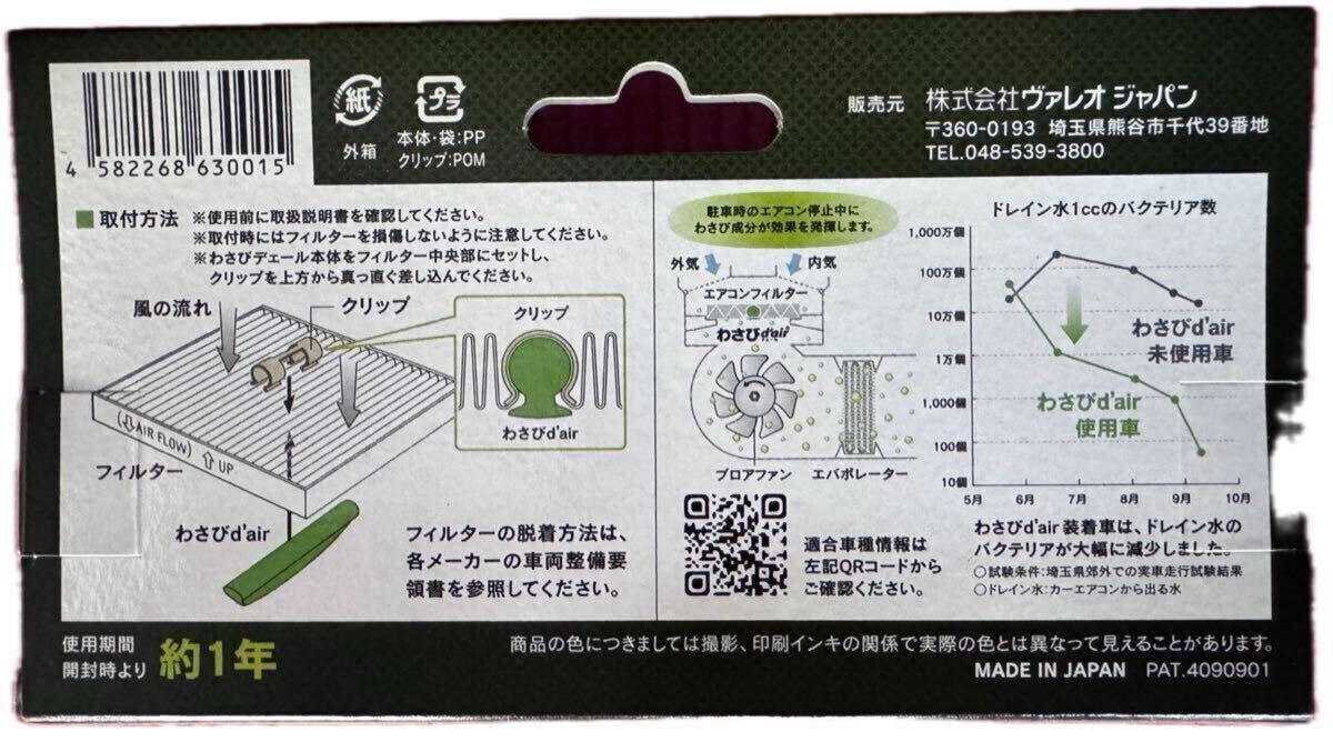 商品名稱 : | Valeo/ヴァレオ わさびデェール カーエアコン用消臭抗菌剤 534242-2420 2個セット エアコンフィルター |
