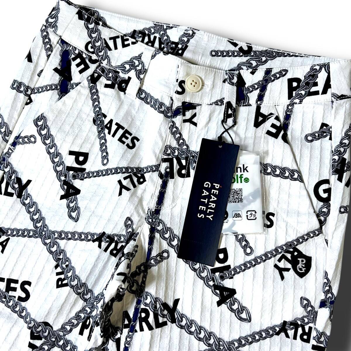 タイトル 新品 PEARLY GATES パーリーゲイツ 定価3.1万 速乾抗菌防臭 シアサッカー調 チェーンモチーフ ビッグロゴ総柄 ストレッチ テーパードパンツ ゴルフウェア レディース GOLF スポーツ レジャー 普段使い タウンユース カジュアル 春夏秋 031 ホワイト系