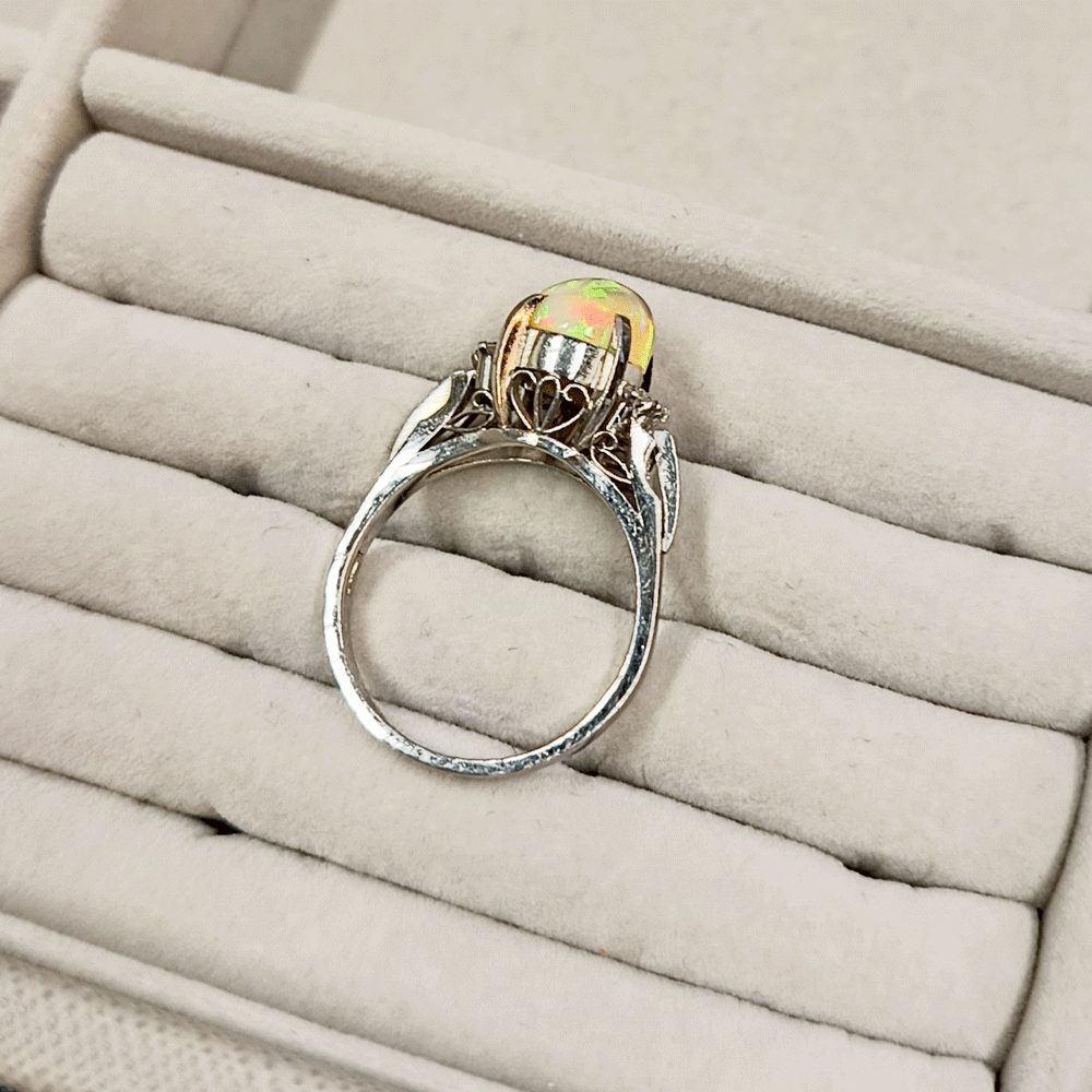 Pt900 オパールリング ダイヤ付◆鮮やかな遊色◆希少天然ジュエリー 指輪 神秘的な虹色の輝きを放つ天然オパールをセットしたリングです。 見る角度によって赤・緑・黄・青と多彩な色彩が揺らめき、まるで光の粒が踊るように煌めきます。 サイドにはダイヤモンドを配し、より一層高級感と華やかさを引き立てています。 オパールは「希望・幸福」を象徴する宝石としても知られ、近年は産出量減少により希少性が高まっています。 Pt900の上質な枠に支えられた美しいデザインは、普段使いにも特別なシーンにも映える逸品です。 ※他サイトでも販売しておりますので入札後に取り消す場合が御座います。 |