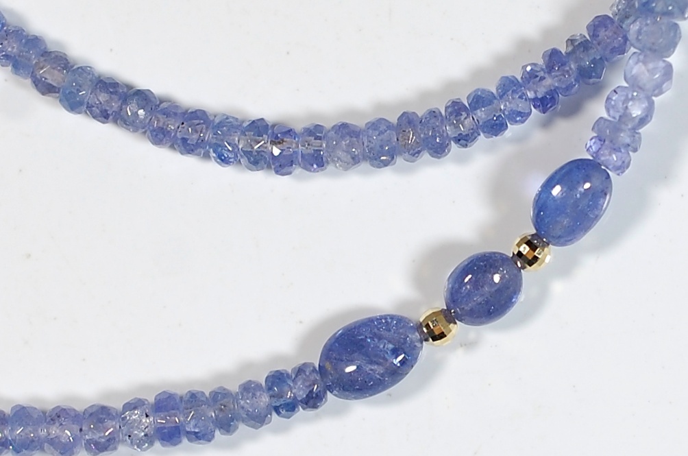 ¥100~K18爽やかなパープルブルー綺麗艶照り良い!天然タンザナイト47.2ct全長43.0cm9.5㌘ NC